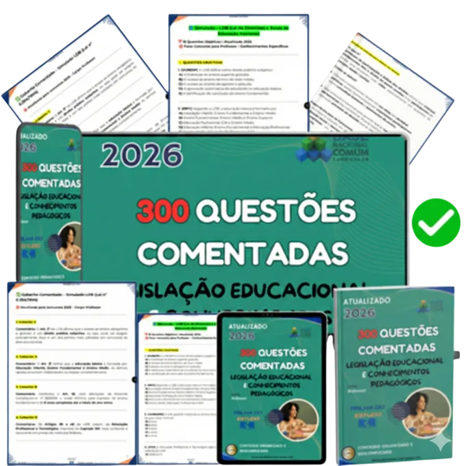 Tenha acesso a mais de 300 questões comentadas, focadas em Legislação Educacional e Conhecimentos Pedagógicos — tudo explicado com clareza, por temas, como a banca cobra